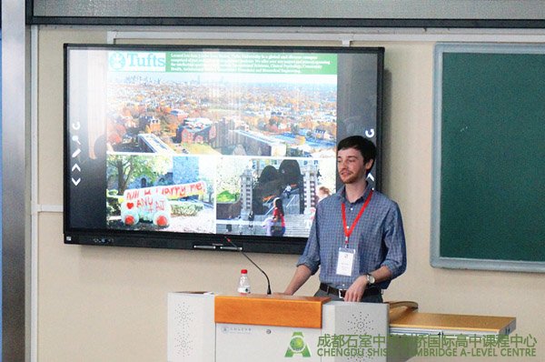 Tufts University的招生官首先向同学们作了介绍。塔夫茨大学是美国新常青藤大学成员之一,四个校区中的三个校区都位于波士顿。在2016年《美国新闻与世界报道》杂志的美国大学综合排名中位居第27名。在介绍大学时,这位招生官向同学们介绍了该校丰富多彩的社团活动和大学概况。