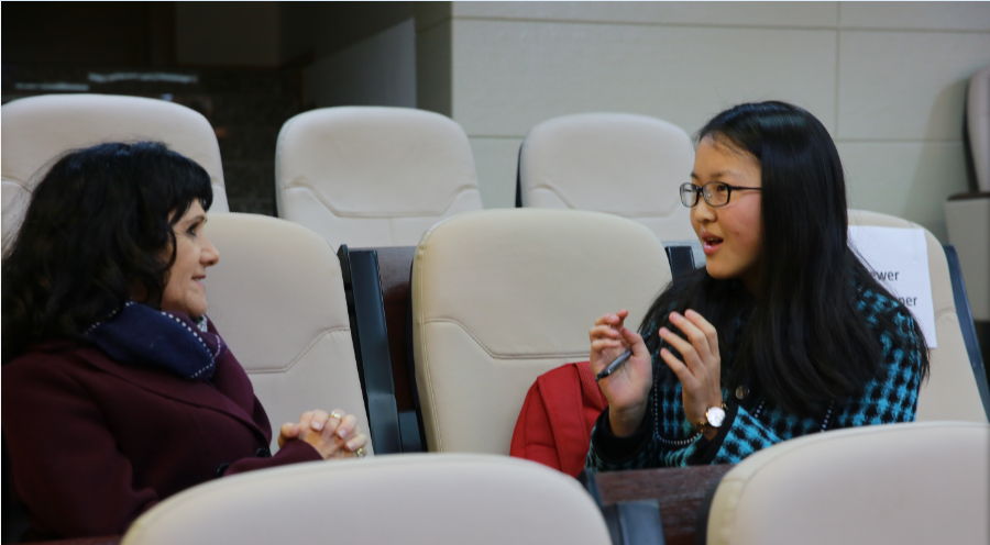 在赫老师为家长们解疑答惑的同时,同学们跟剑桥高中的学长学姐和外教老师们做了深入详细的沟通。外教老师们亲切温和的和同学们聊了兴趣爱好,寒假安排等等话题,聊天时外教用亲切热情的笑容引导着同学们畅所欲言,他们眉飞色舞,非常自信和愉悦。