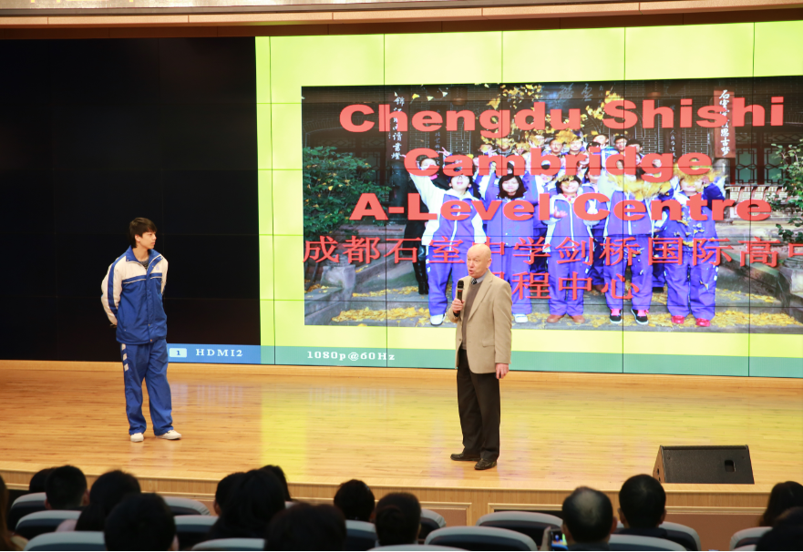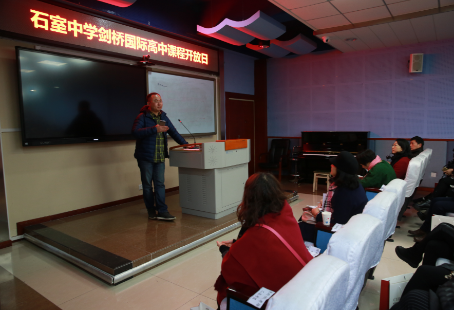 石室剑桥国际高中的学术校长Andrew Derham首先向来临的家长和同学表示热烈的欢迎,做了简短的自我介绍之后,他介绍到剑桥A-Level课程中心的目的是致力于为有意向就读英语国家的大学的学生打好基础,这些国家包括,英国,美国,加拿大,澳大利亚等等。之后他重点介绍到课程中心所教授的科目:在高一时,所有学生都要学习生物、化学、英语、数学、附加数学和物理,中文课和体育课;在高二和高三时,所有学生都要学习英语和数学,另外可按照自己的兴趣选修课,包括:生物、商业学、化学、经济学、进阶数学和物理。最后Derham先生重点说道,他们所有的外教老师都持有所教科目的对应学位和教师资格证,这保证了剑桥A-Level课程中心顶尖的师资配备和优秀的教学质量,是课程中心软实力的保证。