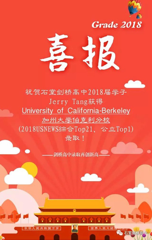 至此,石室剑桥高中的学子已连续2年获得加州伯克利青睐。相信凭着同学们的努力以及学长学姐树立的好榜样,以后剑桥高中定能产生越来越多的伯克利校友。学弟学妹们,加油!