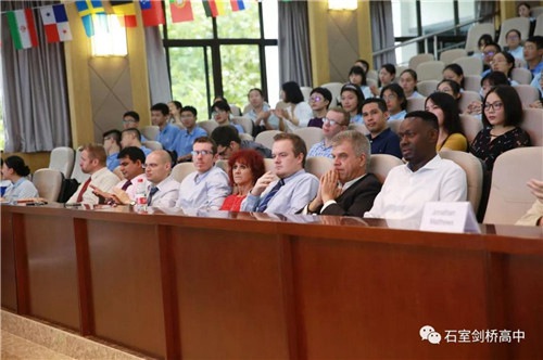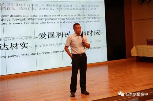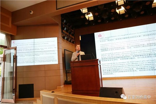 剑桥课程中心学术校长及数学教师Mr.Strugnell代表课程中心致辞,再次向大家介绍了教师团队,今年有3名新外教加入,硕博教师团带来的力量让田校戏称自己要在退休后去攻读一个博士学位,永不放弃提升自己以及提升石室中学的师资力量。Mr.Strugnell提到了去到加州伯克利、罗德岛设计学院、伦敦大学学院、伦敦政治经济学院等大学就读的2018届毕业生们,以此勉励新老学子们奋发上进,在新学年有一个好的开始。