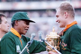 Sport unites us the most as we wear our colours and wave our flag high. Rugby is one of the most supported sports in South Africa, alongside soccer and cricket. The South African team is called the Springboks and they wear green and gold. For the many South African fans of the game, rugby is a serious matter, a source of bursting pride and joy - or shattering disappointment. The country has traditionally fared extremely well on the world stage, and South African fans expect their national team to win every game it plays. Young and old still remember 1995 when the Springboks won the Rugby World Cup on home turf. Nelson Mandela donned the No 6 shirt of the team's captain - Francois Pienaar.