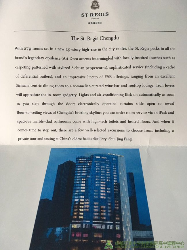 在有足够理论知识的支持下,相比“坐在课堂中”,实地考察更有价值。10月24日上午,在商学及经济学老师Ms.Klopper 的带领下,高三选修经济课的同学来到了St.Regis Hotel瑞吉酒店进行考察。