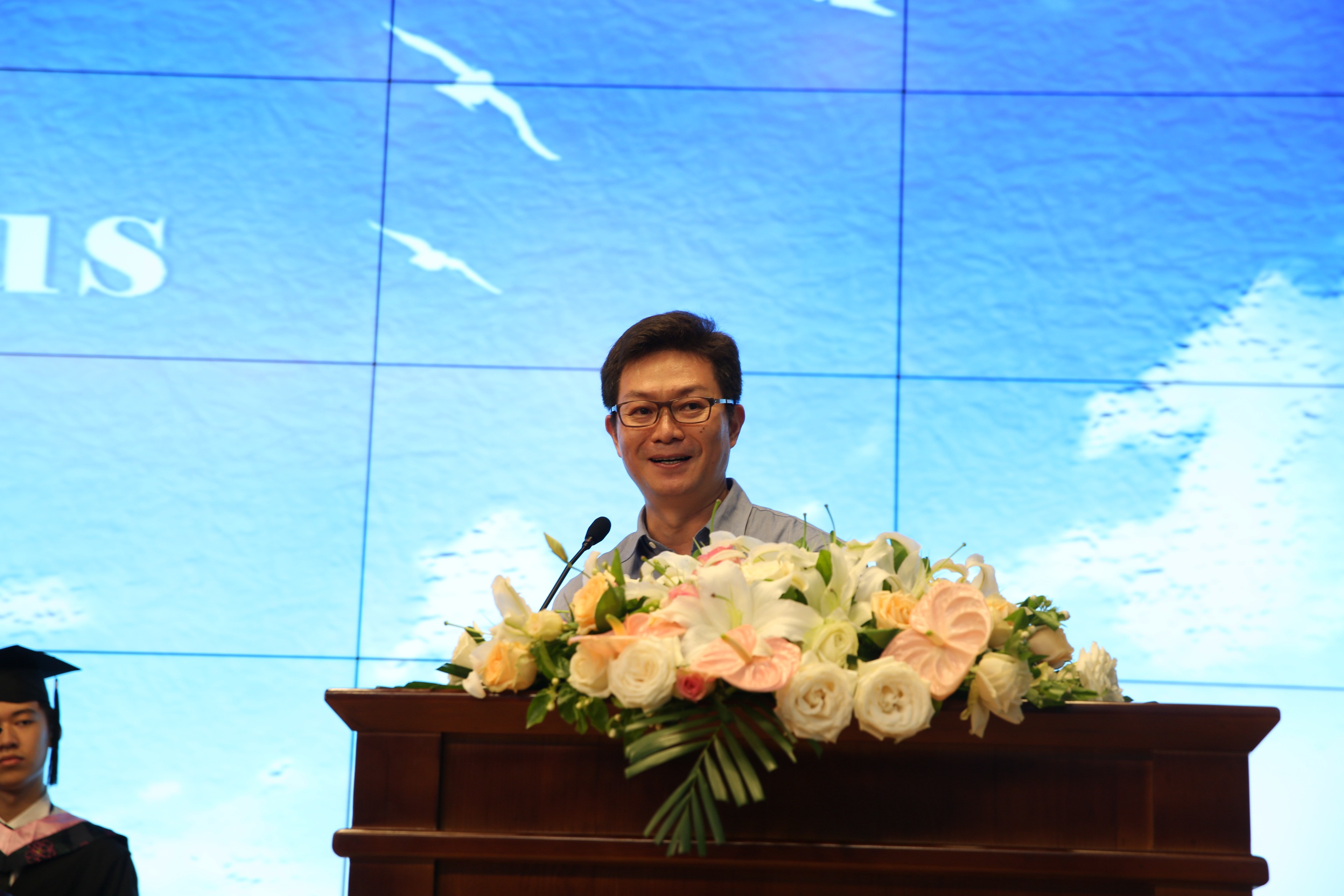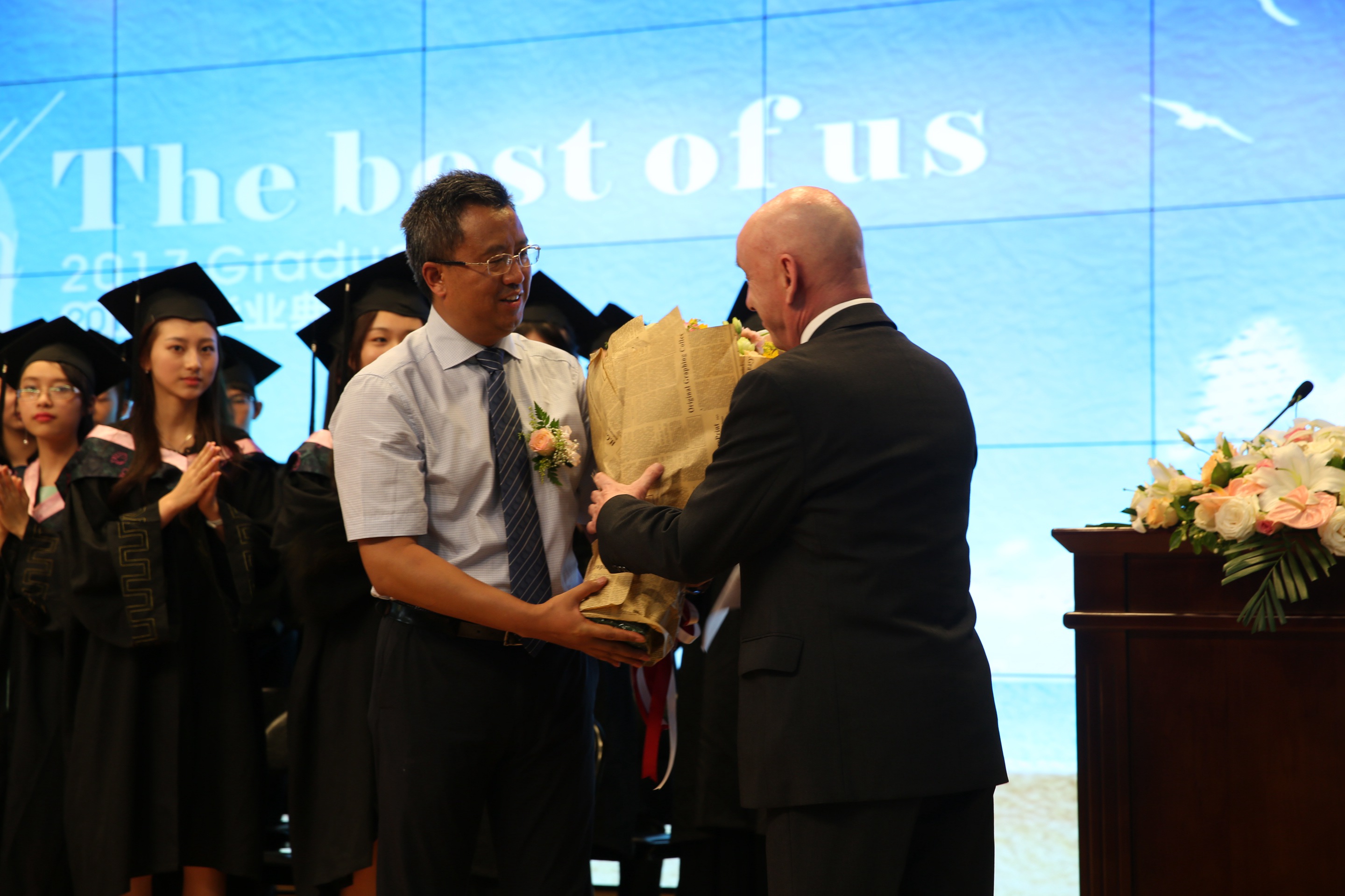 在典礼上,家长代表——王京鹏先生向毕业的学子们表示了衷心的祝贺和真诚的祝愿,同时他非常感谢石室剑桥高中的教师团队对学生们的全情付出,不仅帮助孩子们在学业上不断地创造辉煌,同时也指引教导着他们未来的生活发展。家长们非常欣喜的看着他们的孩子们不断地克服困难,幸福并且健康的成长着。老师们的付出和孩子们的成长打消了他们一开始送孩子进入石室剑桥时的担忧,现在这样有道德,有自信,对未来信心百倍的孩子让他们对自己当初做的决定感到很骄傲。