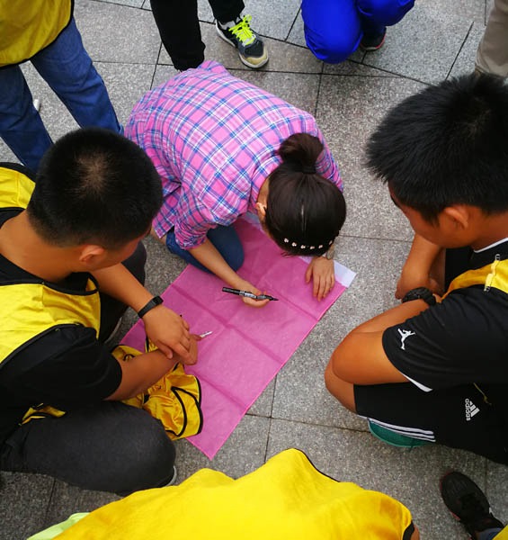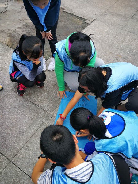 到达场地后,通过简单的游戏同学们分成了黄队和蓝队,两队各自绘制队旗。
