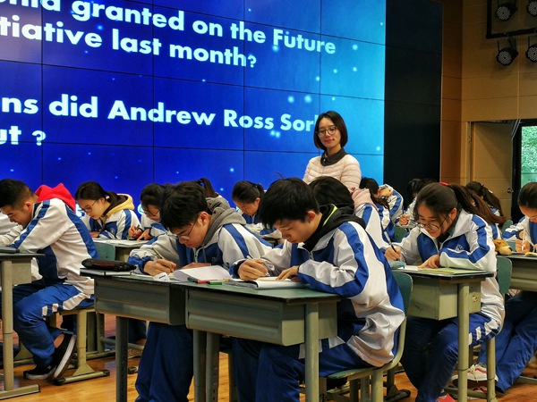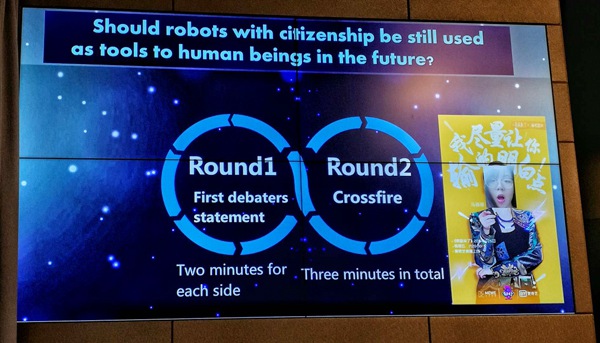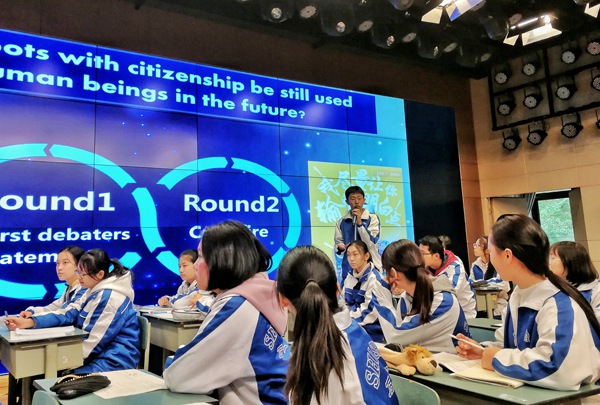 张老师比赛的学生志愿者是剑桥课程中心高三年级的同学,首先她采用了分组辩论的方式让学生探讨“在未来,人工智能机器人是否仍然会作为人类的工具被使用?”。
