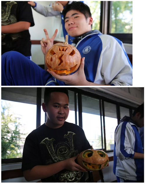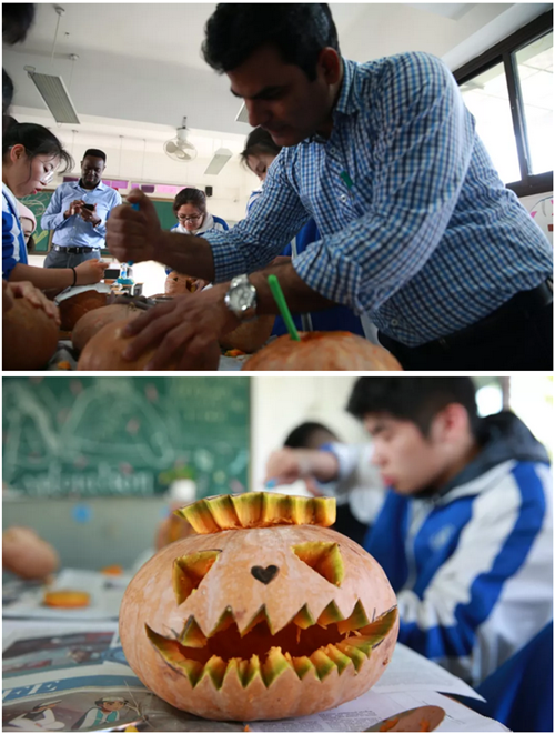 延续去年的主题,今年的万圣节活动仍然以雕刻南瓜灯主,在其它教室还同时进行着趣味乒乓球、咬苹果等有意思的小游戏。