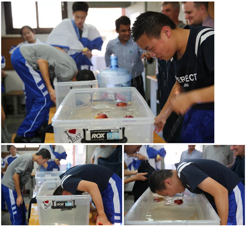参赛者从装满水的大桶或盆中用嘴叼出苹果,先完成者获胜。