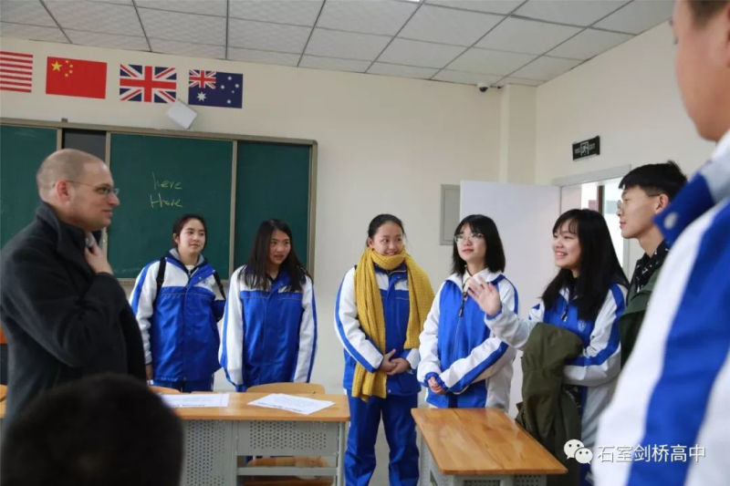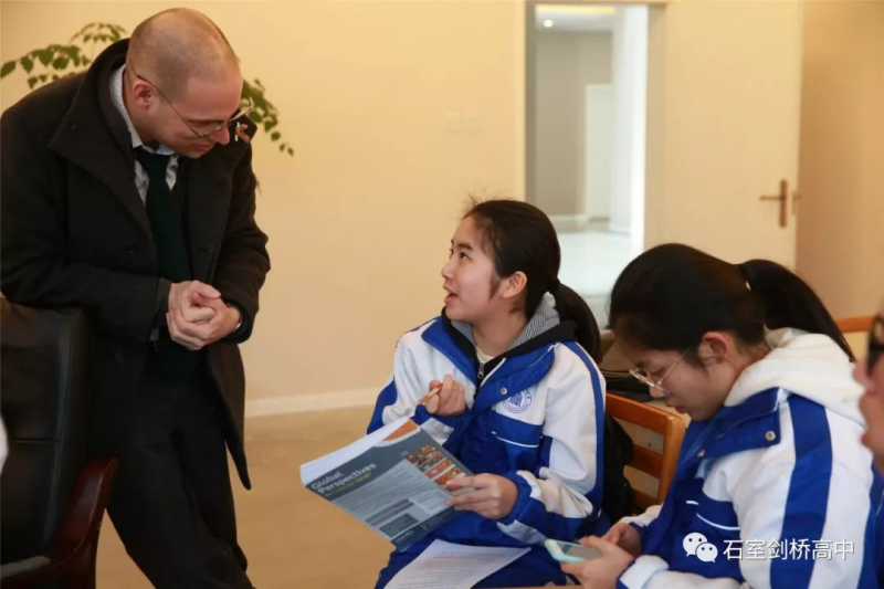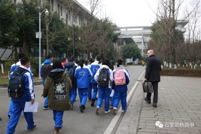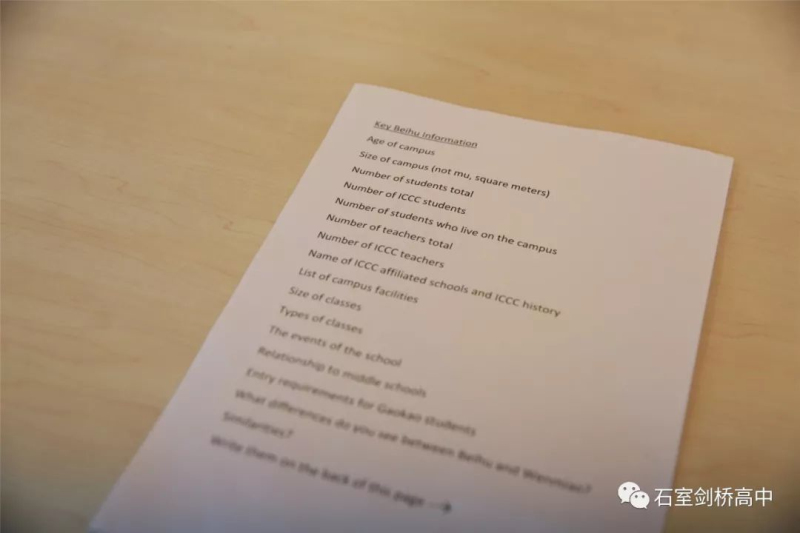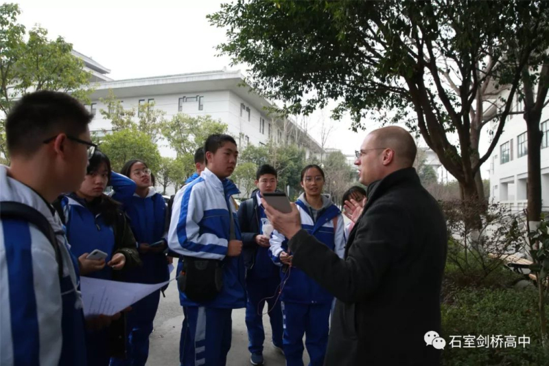 由于石室中学分为两个校区,剑桥高中学子在日常学习生活中已完成文庙校区资料的搜集,现在缺少的则是另一个校区--石室北湖的信息。16日中午1点,Mr.Jones和学生一起,带着早已准备好的问题清单,前往北湖校区调研。当天作为东道主的北湖师生热情相迎,为调研提供了不少帮助。
